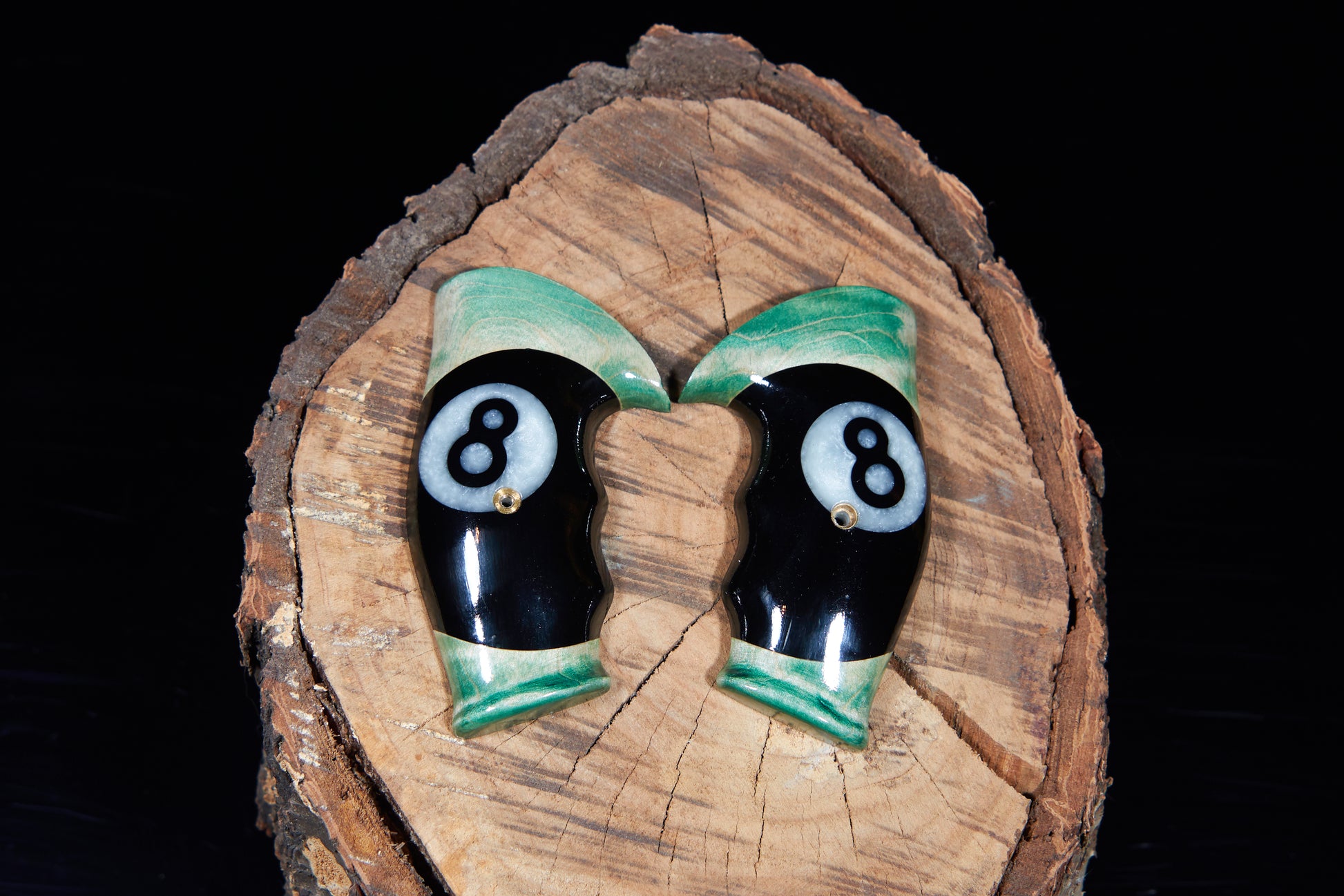 This listing is for Taurus small frame revolver grips. Made from maple, dyed green and sanded. Also given an epoxy inlay of a eight ball for style. I added around 10mm to the bottom for pinky finger comfort.