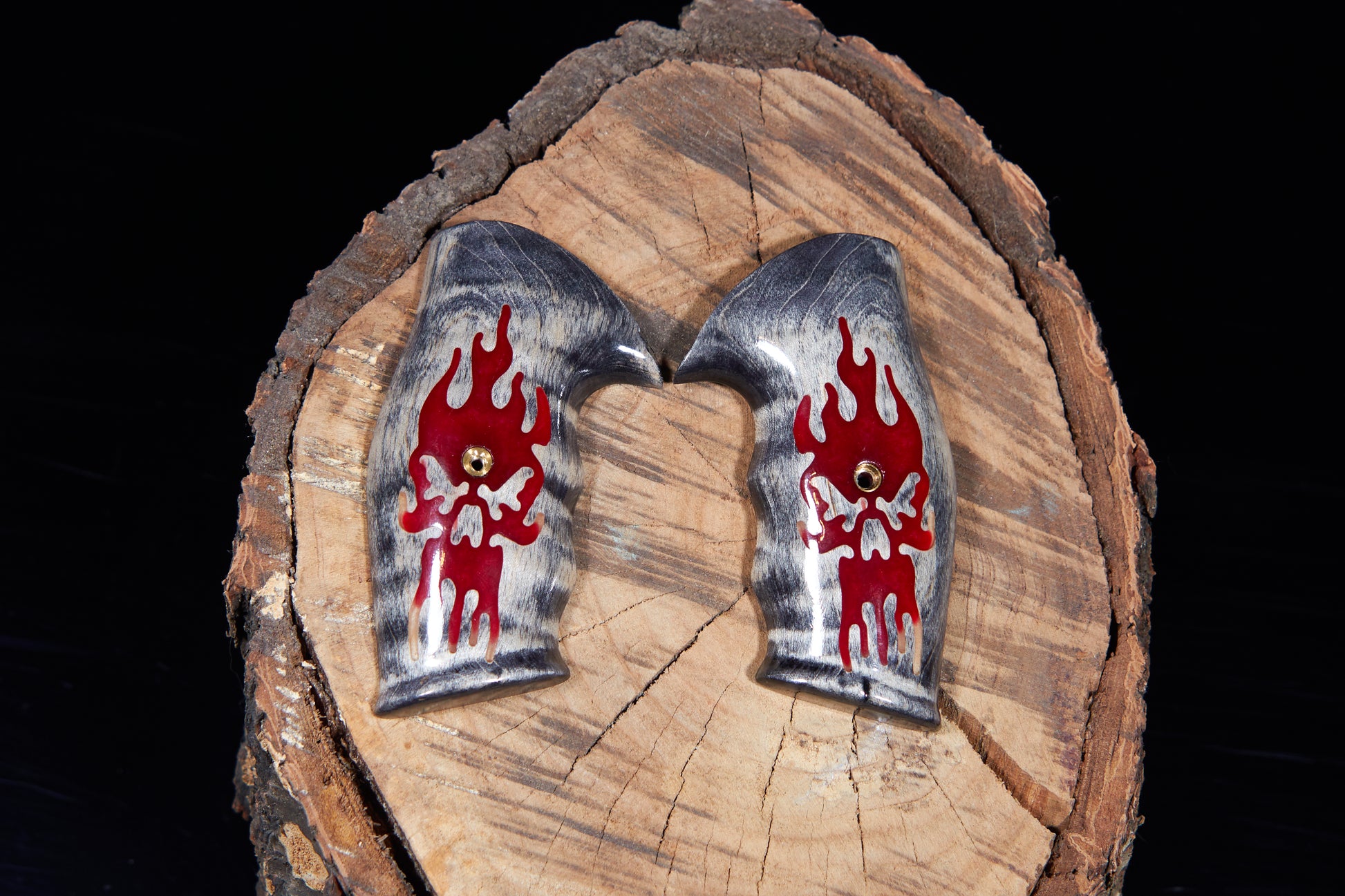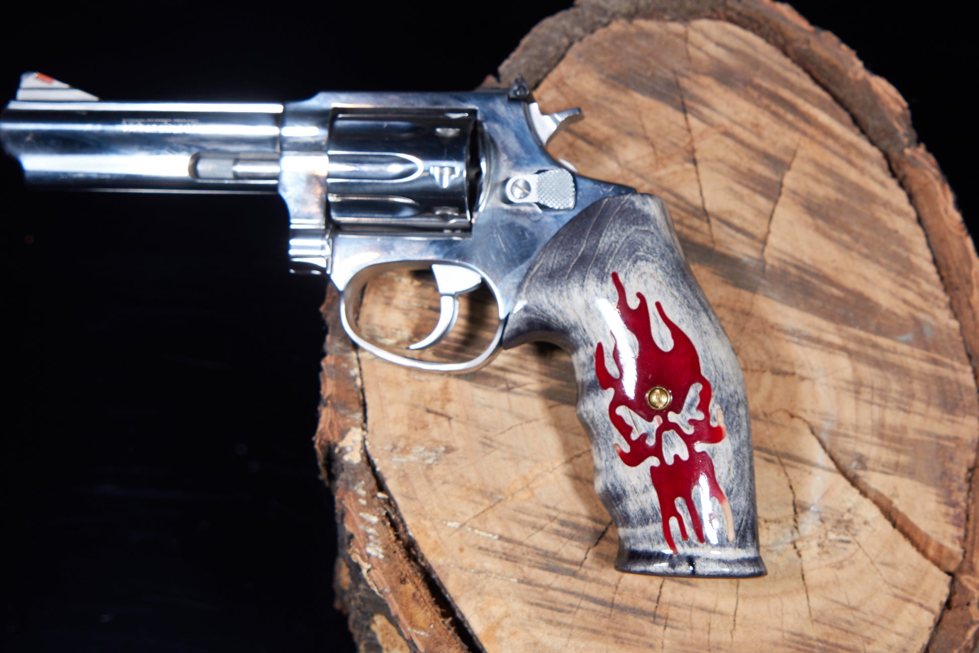 This listing is for Taurus small frame revolver grips. Made from curly maple, dyed black and sanded. also given an epoxy inlay for style. I added around 10mm to the bottom for pinky finger comfort.