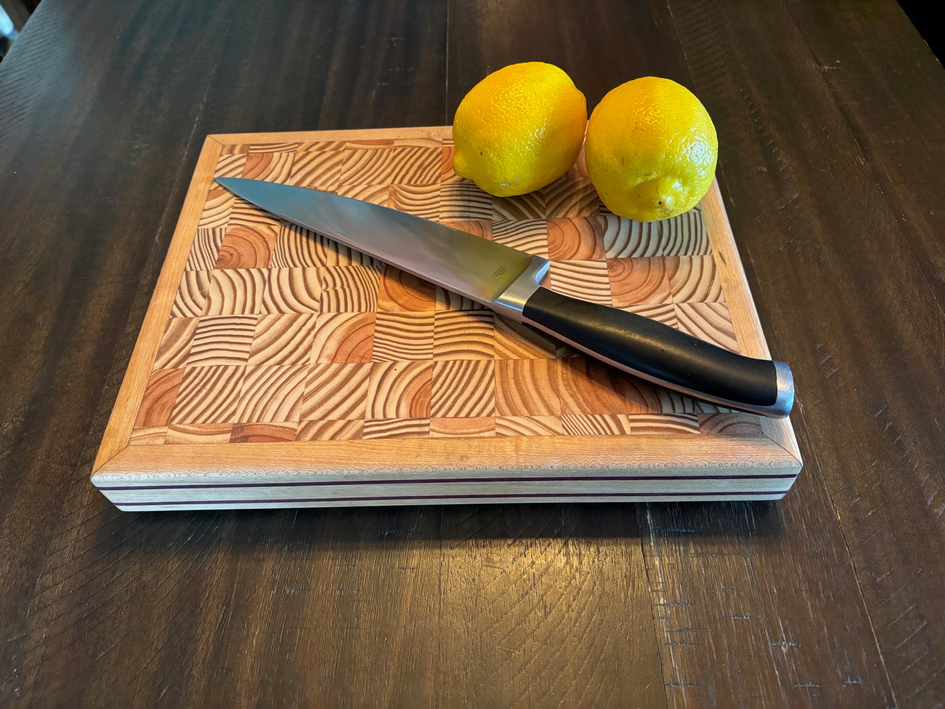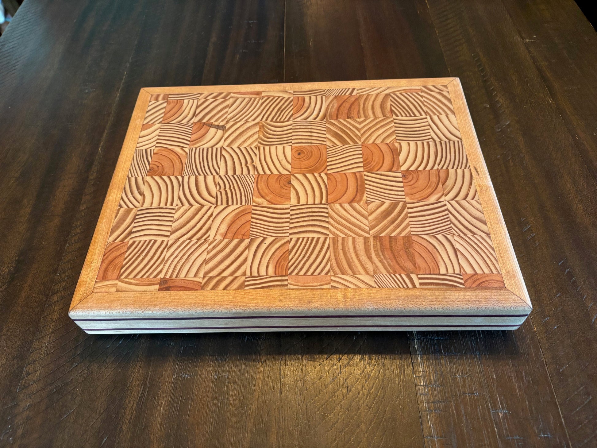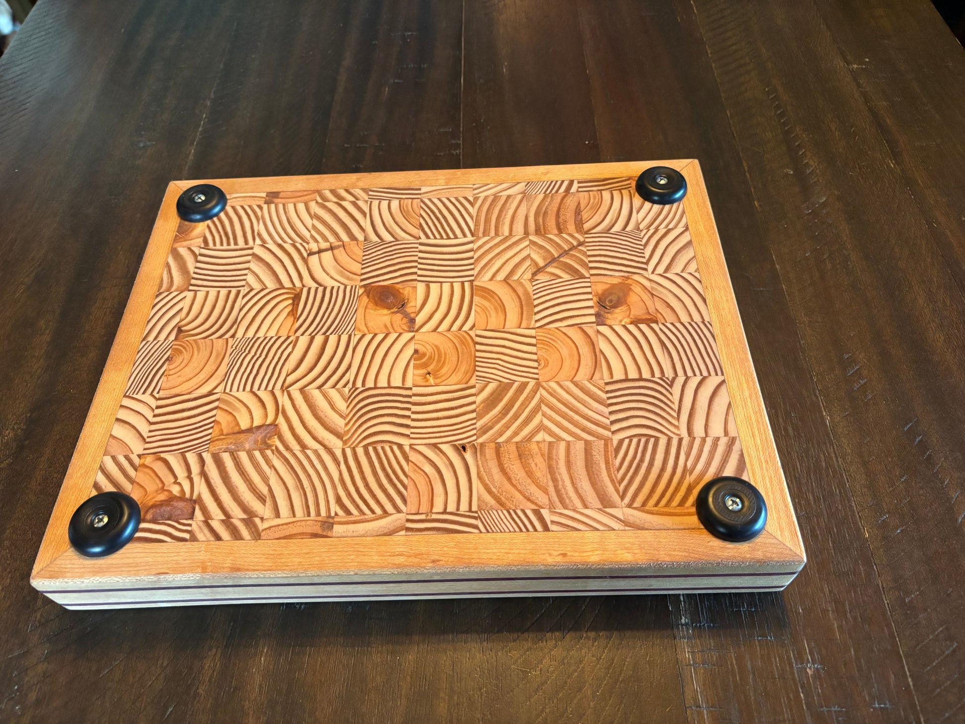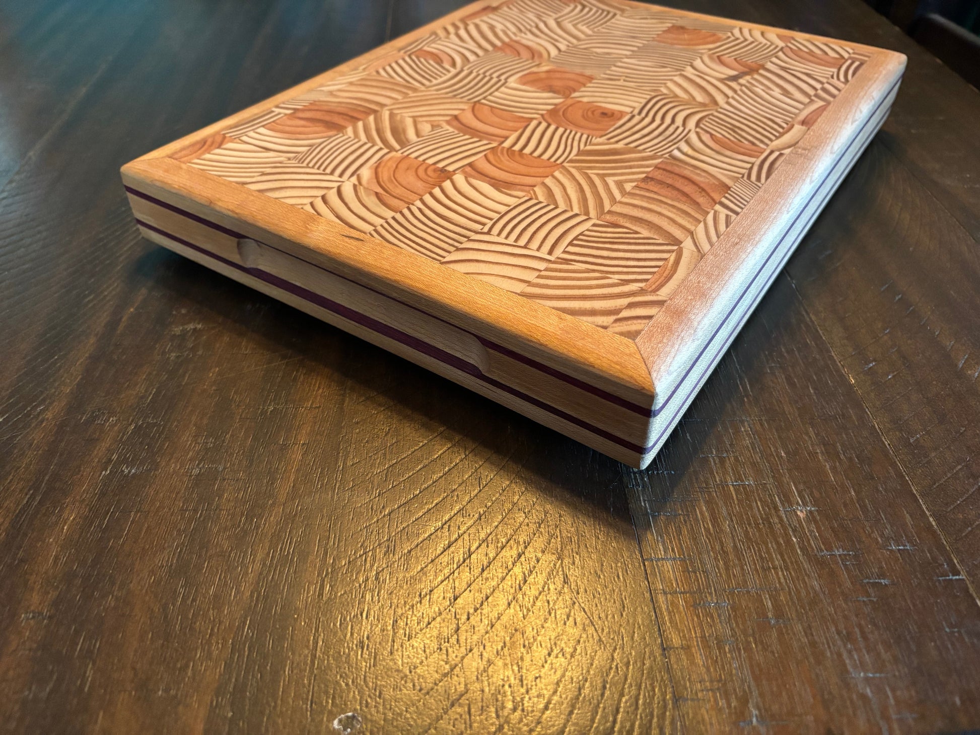 Southern Yellow Pine End Grain Cutting Board with Maple Border and Purpleheart Inlay