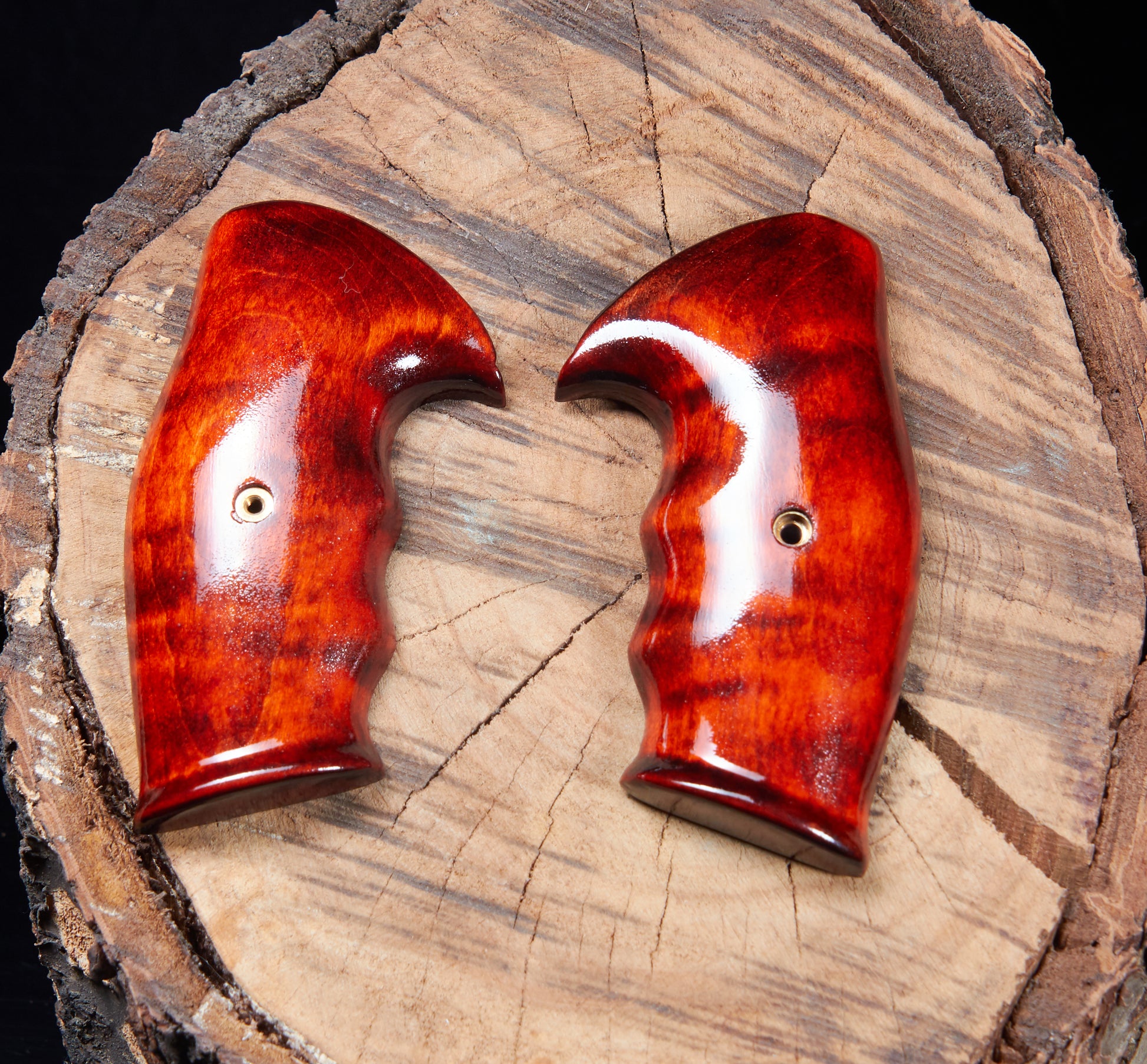 These custom grips are made specifically for Taurus small frame revolvers, crafted from beautifully figured curly maple. The black sand-off technique highlights the natural curl of the wood, creating striking depth and contrast. Sealed with a protective lacquer finish, the result is a bold and refined look that stands out.