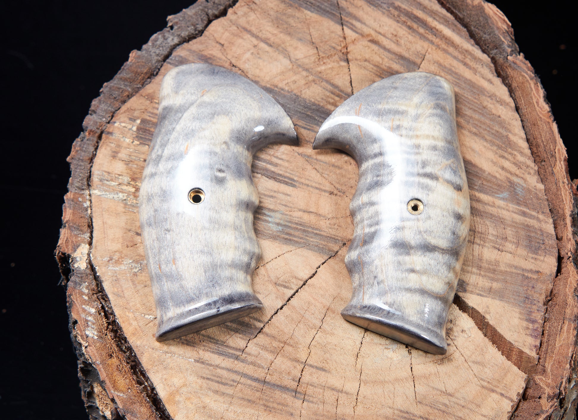 These custom grips are made specifically for Taurus small frame revolvers, crafted from beautifully figured curly maple. The black sand-off technique highlights the natural curl of the wood, creating striking depth and contrast. Sealed with a protective lacquer finish, the result is a bold and refined look that stands out.