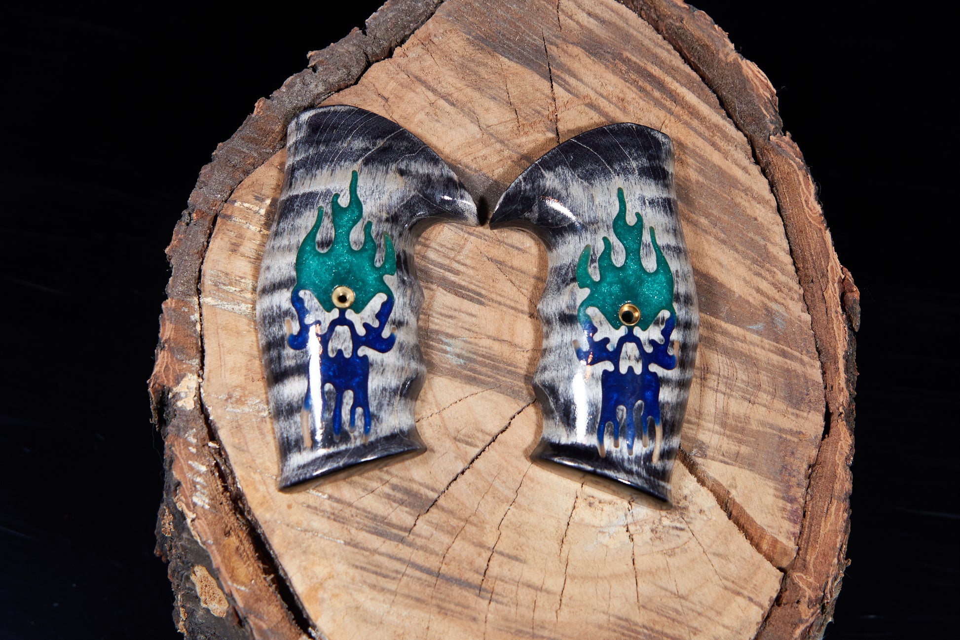 This listing is for Taurus small frame revolver grips. Made from curly maple, dyed black and sanded. also given an epoxy inlay for style. I added around 10mm to the bottom for pinky finger comfort.